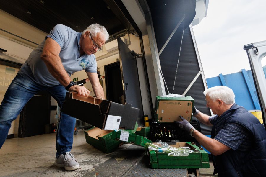 Das Prozedere vor Ort ist immer gleich: Der Transporter fährt an die Rückseite der Märkte; zu den großen Laderampen, wo auch oft die Liefer-LKWs ihre Waren abladen. Deren Fahrer sind oft unter Zeitdruck und reagieren manchmal etwas dünnhäutig auf die Tafel-Transporter. Aber der Ton macht die Musik, glauben Raimund Schäfer und Oswald Pfaffhausen. „Neulich wurde ein Kollege ziemlich unfreundlich. Dem hab‘ ich dann mal kurz die Meinung gesagt. Aber das war die Ausnahme. Meistens kommen wir gut miteinander aus“, sagt Oswald Pfaffhausen lächelnd. Schließlich war er selbst lange LKW-Fahrer. Das merkt man. Wenn er seinen ehemaligen Kollegen durch die geschlossene Windschutzscheibe Rangieranweisungen zuruft („Komm Jung‘, fahr! Wo willste dann hin?!“). Und wenn er den Transporter präzise wenige Zentimeter vor der Laderampenkante zum Stehen bringt. Damit er und sein Begleiter die Kisten nur so weit wie nötig schleppen müssen. Die stehen in den kühlen Lagerräumen schon bereit. Deren Inhalt: Quer durchs Gemüsebeet. Heute gibt’s Blumenkohl, Gurken, Zitronen, Bananen, Äpfel, dazu noch Brot und vieles andere. Das meiste ist noch einwandfrei in Ordnung, nur bei manchen Lebensmitteln müssen Raimund Schäfer und Oswald Pfaffhausen vorsortieren. Besonders bei Obst. Oswald Pfaffhausen greift beherzt in eine Kiste mit Erdbeeren, schaut sich eine Packung an und schmeißt sie dann kopfschüttelnd in eine Mülltonne. Alles andere wandert in die Kisten und Kühlboxen, die im Transporter bereitstehen. „Für Menschen mit Rückenproblemen ist dieser Job nichts“, lacht Raimund Schäfer, während er eine Box mit Radieschen in den Transporter wuchtet. „Wenigstens kann man in unserem neuen Gefährt stehen. Unser altes hatte dafür eine zu niedrige Deckenhöhe, was viel unangenehmer war.“